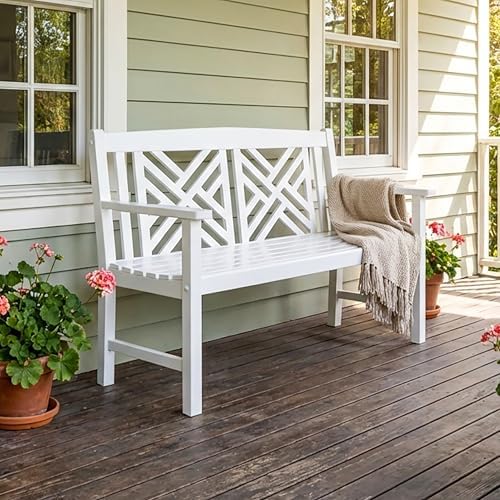 - The elegant Fretwork Benches have a classic English garden style with lattice-work backrest, slatted seat and straight armrests. The White finish evokes a coastal garden charm against colorful foliage and flowers.