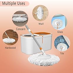 【High-quality mop pad】:The spin mop pad is really thick and fluffy, so you won't feel the scrape of the plastic head while mopping the floor without leaving water stains. There are 5 matching mop replacement heads for long term use. 【More convenient than others】:The 360° spin mop head for home use allows you to get under furniture and into corners to clean stains effectively. 【Extended stainless steel Handle 61"】:The spinning mop handle is metal,very sturdy. Extended to 61" stainless steel handle--no need to bend down to hold it when mopping. 【spin mop with less effort】:Spin mop head can wring out with just a gentle downward pressure.The mop bucket will quickly dry the water to achieve the effect that you want. 【Great sense of design】:Spin mop and bucket system bucket is relatively strong and sturdy while the mop itself is large enough to cover a good area of floor.