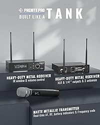 PROFESSIONAL-GRADE WIRELESS PERFORMANCE: Single channel UHF band (555 - 580MHz) audio wireless microphone system with advanced true diversity circuitry to increase anti-interference capability. The handheld microphone delivers exceptionally stable signals and original sound reproduction. 1000 selectable frequencies allow multiset operation and avoid interference in complicated settings. Long-range operation of 300 – 328ft line of sight with quick IR synchronization STURDY BUILD, POWERFUL FUNCTIONS: Heavy-duty all-metal housing for both wireless receiver and UHF wireless microphone. The cordless mic has a specially engineered dynamic cartridge for true sensational sound. This dynamic microphone receiver is equipped with auto scan, squelch control, and lock functions, enabling the system to scan the environment for the least interference frequency, decrease white noises, and lock the best setting. Effectively delivers minimum feedback and cutoffs. COMPLETE TOOL KIT, VERSATILE APPLICATION: The PTU-1U professional handheld wireless microphone & system comes with an antenna kit with extension cords for the rack rig. Users can easily mount the antenna to the front for better reception with the complete tool kit. The system fits as a live performance microphone and professional microphone for singing in any mid-to large-scale venues with its premium sound quality, suitable for stages, live shows, church worship, wedding, DJ gigs, and outdoor events. BOX CONTENTS: 1 x single-channel wireless metal receiver, 1 x UHF handheld microphone, 1 x 1/4’’ audio cable, 1 x power adapter, 1 x anti-rolling ring, 2 x Antenna, 2 x AA battery for 16hrs long hour use, 1 x user manual, 1 x antenna kit Purchase with Confidence: Phenyx Pro products are crafted with premium components and precision engineering, ensuring trusted quality and lasting reliability. We stand firmly behind every product we make