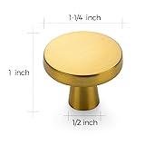 Dimensions: The heavy circular cabinet knob measures 1-1/4 inch (32mm) top diameter, 1/2 inch (12.7mm) base diameter, and projects 1inch(25mm) from the front of the cabinet door or drawer Wide Application: The solid gold cabinet knob, with soft lines, adds a sophisticated touch to kitchen, bathroom, and laundry room cabinets. Available in various finishes, it harmonizes beautifully with your home decor Easy Installation: Cabinet door knobs have a single hole that is easy to install into the pre-drilled hole by including mounting screws 5 Pack gold cabinet knobs include 5pcs 1inch short screws and 5pcs 1.75inch breakaway screws Solid Material: The cabinet pulls constructed by zinc alloy, plated by brushed brass finish, makes the cabinet door knobs anti-rust and anti-corrosion, ensures years of durability and longevity 365-Day Evaluation: We believe you'll value these cabinet knobs. Use them for a full year, and if they don't meet your needs, we're here to assist
