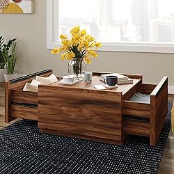 - A square coffee table sets a room apart. This Manhattan Gate® coffee table takes what you know about the centerpiece of a living room and gives it a new century lift. This modern coffee table is built with strong and lightweight panel construction that makes assembly and rearranging in your home easy and stress free. This square coffee table with storage features two storage drawers with full extension slides that holds remotes, pillows, small blankets, magazines, and whatever you need to hide or stow away. The top surface space of this coffee table with drawers is spacious enough for home décor, drink coasters, a candle, and more. Finished on all sides for versatile placement anywhere in your home, this modern coffee table with storage will look polished from every angle. A Blaze Acacia® finish takes this square coffee table from wow to WOW!