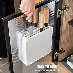 - Universal Knife Holder with 4 Different Sized Slots ● White knife block can hold 3 different knives (blade thickness up to 8mm) and 1 scissors, keeping your knife utensils organized and within easy reach. ● Provide enough space, the bottom of the knife is not easy to touch the surface, can well protect the sharpness of the knife. ● Suitable for fruit knives, vegetable cutters, scissors, bread knives, pocket knives, etc. Removable for Easy Cleaning Knife holder is designed for easy drainage and ventilation, and the removable frame allows easy clean-up when needed, keeping the knives clean. Easy to Install ● You can install it with the included self-adhesive non-marking sticker or screws, both ways are stable. ● Before using the non-marking sticker, clean the wall and make sure the surface is smooth and dry. Please wait for 24 hours before placing knives on the knife holder. Warm Tips 1.Knife holder is designed for daily knives, and may not fit large heavy knives. 2.Please confirm the thickness of your knife handle before purchase, in case the thickness cannot be matched with the knife holder to make the knives fall off. Specification Color: White Size: L 8 x W 1.5 x H 8.3 Inches (20.3 x 3.8 x 21cm) Package: 1 x Wall Mounted Universal Knife Block (Knives not Included)