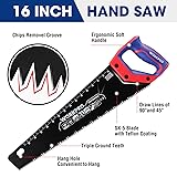 【Anti-rust and Durable Design】This 16-inch universal hand saw is made of high-strength SK5 steel with black Teflon coating, which can prevent rust, reduce friction and offer exceptional durability and long-lasting performance. 【Sharp and Effortless Cutting】 The saw blade is designed with sharp triple ground teeth which allow for smooth, fast and effortless cutting; and the chip removal design provides rapid removal of chips and thus strengthens stability and smoothness during cutting. 【Ergonomic Handle】The non-slip ABS+TPE handle is designed to help reduce hand pressure when cutting and the size will work with any hand size. 【Easy To Use】Our handsaws have built-in 45-degree and 90-degree angle markings for guided cuts, and 29cm scale markings on the surface to ensure accurate measurements and quick cuts; extra plastic protection on teeth for safe storage and carrying. 【Wide Application】The hand saws for cutting wood also tackle a variety of other daily basic cutting tasks, suitable for cutting boards, PVC, laminates, tree branches and other materials. Widely used in gardening, decoration, wood processing, DIY maintenance, etc.