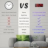 ATTENTION: It is a PLUG-IN electric wall clock, NOT a battery-operated clock. The backup battery can only help to preserve time in case of power outage. [Small Wall Clock with Large Digits] - This LED Digital Wall Clock features large 2.8-inch digits, significantly bigger than the 1.8-inch digits on a 16-inch atomic wall clock. We believe this larger display will make it easier for you to read the time at a glance. [Better Font Design] - Our Modern LED Wall Clock features large digits and well-spaced fonts, ensuring it remains easily readable even from a distance. [3-Level Auto-Brightness] - Automatically adjust the display brightness according to the brightness of the environment. High brightness for clear visibility during the day, moderate brightness to create a comfortable ambiance indoors at night, and low brightness for complete darkness, ensuring a peaceful sleep environment for you. [Easy-Hanging Design] - We've included two convenient positioning pins on the back to help you effortlessly mark where the nails or screws should go, making your installation a breeze. [10-Ft Long USB Power Cable] - This convenient 10-foot USB power cable allows you to place your Silent Wall Clock anywhere you desire. [12/24-Hour Time Format] - Easily switch between 12-hour and 24-hour time formats with just one click. [Memory Function] - In the event of a power outage, this feature helps preserve your settings and time, ensuring everything remains just as you left it. This Digital Wall Clock has been specially designed with you in mind for a variety of indoor spaces including living rooms, bedrooms, classrooms, farmhouses, kitchens, offices, nursing homes and more. We believe it will be a perfect fit for any room where you want to add both functionality and style.