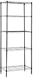 5 shelf wire rack offers handy storage space and easy access to tools and supplies Durable steel construction with a Black finish; each shelf holds up to 200 pounds, evenly distributed; 1000 pound total weight capacity Adjustable shelf height in 1-inch increments for easy customizing; 4 leveling feet for stability Multi-purpose versatility; use in a garage, laundry room, kitchen, playroom, or other living or work space Assembles quickly and easily; no tools needed