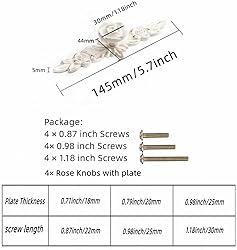 - European Style Rose Cabinet Knobs with Backplate, Vintage Drawer Pulls, Zinc Alloy Flower Drawer Pull Handles for Dresser Vanity Nightstand Cupboard (5.7" Ivory White & Gold Edge) Packing: 4× Rose Knobs with plate 4 × 0.87 inch Screws 4 × 0.98 inch Screws 4 × 1.18 inch Screws Specification Material: Zinc Alloy Size: Height is approx 2.5cm/1.0"; Plate: 145mm/5.7" in length Screw diameter:4mm/0.157" Screw length≈Board thickness + 0.2" The knob is separate from the plate, so if you decided not to use the plate, you could just use the knob. Installation: 1.Locate and mark where to place the knobs on the drawer; 2.Drill hole through the front of the drawer/cabinet at the knob's marked location; 3.Push and screw the bolts through the holes from the backside of the drawer/cabinet. The Best Unconditional 30 days Guarantee For Free! We hope you have a pleasant shopping experience with us and satisfy . If there are any items or delivery problems, please email contact us first, we can address your concerns in 24 hours usually. Please give us the opportunity to resolve any problem, Thank you!