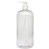 - (3pc) 1000ML/34OZ Clear Plastic PET Boston Round Refillable Pump Bottle and pumps. Great for Soap, Shampoo, Conditioner, Hand Sanitizer, Lotion etc. Great use in kitchens, bathrooms, offices, schools, etc. The plastic press bottle is made of BPA-free plastic and can be safely used for contents whose temperature is between -60 and 130. However, for your safety, we do not recommend that you put contents that are too hot.