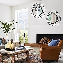 【 UNIQUE CIRCLES LOOK ADDS A LOT TO YOUR HOME 】these mirrors wall decor have circle on circles design . it’s a novelty home décor with modern and artistic looking. You will create a touch of luxury to your room with these pieces of wall art. 【 SET OF 2 IN DECENT PACKAGE 】package come with 2 pieces cute mirrors in it, which are prepared for free styling and combination with other wall art pieces. Just arrange and match as you like with these cost-effective mirror arts. 【 15.7 INCH PERFECT SIZE 】 each mirror has 15.7 inch diameter with frame. Mirror along measures 10 inch. The size is just perfect to decorate the bedroom /living room or entryway as a boho decoration or hang them on in bathroom as functional dressing mirrors. 【 IRON FRAME - STURDY AND EASY TO HANG 】 Hanging these round mirrors with just one screw put into the wall. The mirror weight is 2lb, which is light to install. High quality annealed glass prevents warping and distortion, give you a real HD imaging. 【 JUST THE RIGHT SHADE OF BLACK 】 The black framing of these art pieces is something between matte and a bright color, not too bright and not dull , just perfect to pop a dark wall. Crystal clear mirror adds a shade of reflection to the space nicely. 【 COLOR AND STYLE MATCHES EVERYTHING 】 These mirrors are the perfect addition to the picture wall or above the TV, or to the entryway and office space. They can style a wall independently or combined with other pieces of wall art like paintings/wall sculpture/candle sconces. It will look great anywhere you can try.