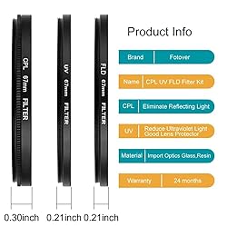 [CPL Filter] : This Polarizing filter diminishes ghosting effect from reflected light,increases the contrast of blue sky and white clouds in landscape photography,improves overall colour saturation;Reduces or eliminates glare,effectively helps remove unwanted reflections from surfaces such as water and glass in addition to light reflecting off moisture and pollution in the atmosphere.It plays an irreplaceable role in photo post processing. [Ultra Violet Filter and FLD Filter] : UV filter is to reduce ultraviolet light and protect your beloved lens from dust,scratch and collision,perfect for outdoor photography.FLD filter is to reduce the greenish tone under fluorescent lighting,giving natural light colors. [Note] : This universal filter set fits all Same caliber lens.Please verify your camera's lens thread size before ordering. Your camera's lens thread size will be marked somewhere on the lens barrel or printed underneath your lens cap. [Package] :Includes 52mm UV filter x 1,1 x 52CPL filter,1 x 52mm FLD Filter,1 x 52mm centre pinch lens cap ,1 x Microfiber Lens Cleaning Cloth. [Warranty] : We offer one year warranty and life-time after-sales service,if you meet any problem,please feel free to contact us.
