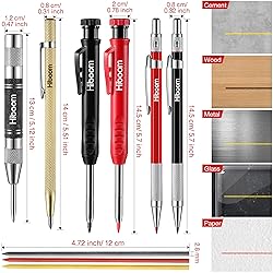 Heavy Duty Carpenter Marking Set: this Hiboom carpenter pencil set includes 2 pieces deep hole carpenter pencil and 2 pieces mechanical carpenter pencils with 36 pcs marker refills(4 boxes and 3 colors), 1 piece automatic center punch tool and 1 piece carbide scribe tool; Widely apply for metal wood glass ceramics paper and more; Multiple tools can meet your different marking needs in working Built in Sharpener Carpenter Pencils: the woodworking pencils come with a built in sharpener screwed into the top of each pencil for convenience; There are totally 4 solid carpenter pencils, 2 of which are deep hole carpenter pencils; 45 mm deep hole extended and needle nose tip design make construction pencils can fit into small holes Reduces the need for adjustments in hard to reach areas, improving woodworking efficiency and ensuring accuracy and convenience Spring Loaded Center Punch: the metal punch is made of chrome plated steel body and deeply knurled surface, which means that it will not slip and offers more precise handling and control; The adjustable tension screw allows you to use one hand to operate with little effort, which can easily and accurately mark a centering spot for drilling holes Precise Metal Carbide Scribe: this etching engraving pen has a reliable tungsten carbide tip and knurled aluminum body, providing more control and comfort; The metal scribe comes with a protective vinyl cap over the scribe tip while not using, to prevent the tip from damaging other things Widely Use: Hiboom mechanical carpenter pencil set features a convenient pen type and comfortable grip design and comes with a handy pocket clip; 36pcs black red and yellow refills can meet your marking needs for a long term, these refills also compatible with other's brand pencils; This carpenter tools set is suitable for machinist architect carpentry working