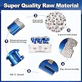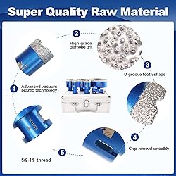 Size --Diamond drill bit 4/5" 1" 1-1/4" 2" 3" 4"(20 25 35 50 75 100mm),each size 1pc,diamond height 10mm, total length 60mm, 5/8-11 thread of the tile drill bit. Wide Application of drill bit --Worked great for porcelain tile, ceramics, bathroom tile,marble granite,stone,masonry, brick with ease,Using water could prolong the lifetime. Super Quality Raw Material --Using vacuum brazed technology,makes the diamond particles better attach to the core steel, imporve the performance and lifetime.High-quality core steel body helps to be more efficient and durable, not easy to deform Fast and Smooth Drilling --Special U-groove tooth shape and chip removal design of the tile hole cutter creates a high sharpness, you could drill smoothly with no broken edges Easy to work:can be fixed on Angle Grinder of 5/8-11 thread firmly and drill various commonly used holes for building/remodeling a bathroom or kitchen,Convenient to organize these diamond tip drill bits into this Box