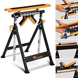 【4-IN-1 OMNIPOTENT WORK CENTER】WORKESS integrates the complete functions of Roller Stand, Saw Horses, V-shaped and multi-directional rollers, which can realize flexible movement of boards, fixed rolling of round materials, expansion of sawing machines, and also the function of workbench. Make you enjoy the fun of "do it yourself". 【MORE STABLE THAN THE PRODUCTS YOU'VE EVER USED】The whole unit is made of heavy-duty square steel, and the triangular structure with four leg supports and crossbeam fixing enables it able to hold up to 440 lbs of weight which weighs more than 3 times as much as the traditional table saw roller stand. Each foot uses a non-slip rubber base, and the rock-solid stability can bring you unparalleled confidence when working. 【ADJUST THE HEIGHT TO LEVEL】WORKESS adjustable roller stand allows 10-step adjustment in the height range of 33"-50"and can follow the work situation for leveling; the sturdy double locking lever and wedge-shaped design of the lifting column ensure no more sliding and accidental drops while you are working. 【YOUR FAVOURITE “ROLLING”】7-ball bearing multi-directional rollers made of high quality steel, with zinc-plated surfaces, will not rust while gaining a smooth rolling experience; polished directional rollers and v-shaped rollers have superior sealing design, even in a dusty workshop, also will not reduce the rotational performance. 【MAKE GARAGE A PROFESSIONAL WORK CENTER ANYTIME】Don't hesitate, WORKESS has a simple structure.It is a breeze to assemble it, and you can quickly unfold and fold it completely in just two steps without taking up much space. Try it, you will find how convenient and sturdy the mini work bench is. 【QUALITY - PREREQUISITE OF AFTER-SALE SERVICES】WORKESS has quality and safety certifications such as BSCI, ISO9001, ISO14001, OHSAS18001 and so on. If you meet any problem during the use, you can contact WORKESS in the first time, we will offer professional service with engineers to provide you with high quality after-sales service.