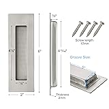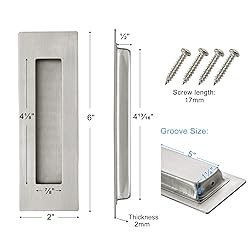 Durable 304 Stainless Steel: The sliding barn door pulls handles are made of 304 stainless steel, they are rust-proof and durable, also a good heavy duty door handle. Brushed surface is more beautiful Comfortable to The Touch: The surface and edges of the pocket door pull are finely chamfered without sharp edges. The 1/2 Inch finger depth provides a comfortable grip Flush Mount: The sliding closet door handle is perfectly fixed in the slot by 2 screws (or glue), the screws on the top are invisible and look more beautiful. (Slot size 5" x 1-1/4" x 1/2") Application: The recessed rectangular flush finger pull is suitable for pocket door, sliding barn door, bifold door, french door, patio sliding door, farmhouse pulls, and so on Dimensions: Set of 4. The recessed pull handle size is 6 Inch x 2 Inch x 1/2 Inch, and the panel thickness is 2mm. The slot size is High 5" x Width 1-1/4" x Depth 1/2"