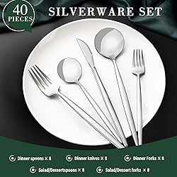 ERGONOMIC HANDLE & UNIQUE DESIGN: CEKEE cutlery set is the slender round handle head design which simplifies the bulky stainless steel silverware but ensuring the durability. This forks and spoons silverware set makes you enjoy the food comfortably and easily PREMIUM STAINLESS STEEL FLATWARE SET: Kitchen utensils is made of extra thick refine food grade stainless steel, which is very sturdy, corrosion and rust proof, nickel free and will not produce residues or odors like other materials. Most importantly, spoons and forks set is totally DISHWASHER SAFE EXQUISITE WORKMANSHIP: Smooth surface and highly mirror polished makes this flatware set always keep shining. What's more, simple classic modern design would make your table settings elegant and different and enhance your dining experience every meals. And steak knives's edges are sharp enough to slice cleanly through all the meat effortlessly 40 PIECES SILVERWARE SET FOR 8: CEKEE flatware set for 8 includes 8 dinner forks, 8 salad forks, 8 dinner knives, 8 dinner spoons and 8 teaspoons, essential for families or restaurants. Utensil sets can satisfy most family of 8 people and apartment, home, hotel, restaurant and kitchen essentials MULTIPLE USES :These forks, knives, spoons silverware perfect for Daily Use, Wedding, Christmas party, Gathering, Camping, Restaurant or Hotel, which is apartment or home essentials