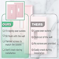 - Package includes 2 pcs of 1 toggle light switch covers and 4 matching screws. The pink color is perfect for kids' and nursery rooms.Bates 1 toggle light switch cover is made of unbreakable polycarbonate thermoplastic; this wall plate can withstand hard impacts and heavy force. It's also flexible and will not break or crack easily.Our 1 toggle light switch covers are made to match any standard configuration and measure 4.5" x 2.76". Plus, they're easy to install - simply screw them into place using the included hardware, and you're done!These wall plates can beautify your house; their smooth, glossy finish and soft edges without recessed lines allow easy cleaning. The simple design makes these plates more elegant.Bates 1 toggle light switch covers are perfect for DIY projects, such as repairs to upgrade personal residence and commercial residence decorations.