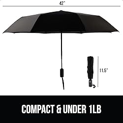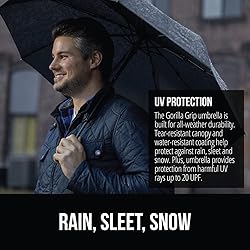 - HEAVY DUTY WIND RESISTANCE AND UV PROTECTION TESTED The Gorilla Grip Umbrella is built for all weather durability; constructed with 8 reinforced fiberglass ribs and a tear-resistant canopy, the umbrella can tackle high winds without bending or snapping; windproof up to gusts of 23 mph; rust resistant for long lasting use; also provides protection from harmful UV rays up to 20 UPF COMPACT AND LIGHTWEIGHT Umbrellas for rain canopy is 42 inches wide when fully expanded for maximum coverage, and collapses down to 11.5 inches, so this umbrella can easily fit inside backpacks, purses and other carry bags; plus it is so lightweight at only .9lbs; perfect for on the go; includes a convenient carry pouch WATER RESISTANT COATING Unlike many others, this umbrella travel size features a water resistant coating that helps ensure water repels off the canopy rather than soak through; umbrella canopy is made from 190 Pongee fabric that is more durable than polyester and designed for heavy rains; material is quick dry and dries efficiently AUTOMATIC 1 HAND OPEN DESIGN No more manual opening and closing of umbrellas; this umbrella features a one click easy open and close button that keeps one hand free, and provides easy access to your compact umbrella travel size during sudden rainstorms; seamlessly open at any time SLIP RESISTANT EASY GRIP HANDLE Folding umbrella’s stick handle is slip resistant and soft touch, making it easy to grip even over long periods of time