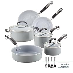 SUSTAINABLE COOKWARE SET INCLUDES 1-quart saucepan with lid, 2-quart saucepan with lid, 5-quart Dutch oven, 3-quart sauté pan, large vented lid that fits the sauté and Dutch oven, 8.5-inch frying pan, 10-inch frying pan, and four Prestige kitchen utensils including a slotted turner, slotted spoon, pasta fork, and solid spoon GET THE EcoAdvantage You don't have to sacrifice performance for sustainability. Farberware EcoAdvantage cookware is made from energy efficient, 100% recycled aluminum that still heats up quickly and evenly for reliable results, recipe after recipe. COOK EASY, COOK HEALTHY Pots and pans feature a longer lasting, scratch-resistant ceramic nonstick that requires less oil for healthier cooking and effortless food release. Easier cooking and easier cleaning so you can spend more quality time during mealtime. CRAFTED FOR CONVENIENCE Dishwasher safe nonstick cookware set is easy to clean and includes built-in features like pour spouts on the saucepans and a steam vent on the sauté pan and Dutch oven lid to accommodate a wide range of family favorite recipes. HEALTHY AND NON-TOXIC Cookware is made without PFAS, PFOA, PTFE, lead, or cadmium for pots and pans that are safe to cook on and don't sacrifice an ounce of quality along the way.