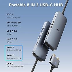 Portable 8-In-2 Macbook Docking Station: Expand your MacBook Pro (2024-2016) or MacBook Air (2020-2018) with this Mac docking station. Transform your MacBook’s USB-C port into 8 versatile connections: 2x 4K HDMI, 3x USB 3.0, SD/TF card reader, and 100W PD charging. NOTE: Only compatible with MacBook models that have 2 Thunderbolt 3 ports on the same side. Please ensure your MacBook has dual USB-C ports; this dock is designed only for MacBooks with USB-C and is not compatible with single-port devices like iMac or Mac Mini. Stunning Dual 4K Displays: Experience vibrant Dual 4K@60Hz video on external monitors, projectors, or HDTVs. With this Macbook Docking Staion Dual HDMI ports, you can extend or mirror your MacBook’s display, perfect for streaming movies, presentations, or multitasking. NOTE: For Apple M1/M2 laptops, dual external displays are not supported—one of the monitors will remain black when connected. (DP1.2 source only supports dual 4K@30Hz) Super-fast Data Transfer with 3 USB 3.0: Connect your devices quickly and efficiently with this macbook dock 3x USB 3.0 ports, providing data transfer speeds up to 5Gbps. Easily sync smartphones, tablets, or external hard drives, while enjoying seamless data access 100W PD Charging Port: This Mac USB C Hub connector supports charging for your MacBook and other peripherals. Note:This device does not include charger or cable. Please use a certified charger compatible with your laptop, and The 100W PD is only compatible with Intel-based MacBook Pro/Air models SD & Micro SD Card Slots: Easily transfer data with the built-in SDXC and Micro SD card slots, offering speeds up to 104MB/s. Both SD and TF slots can be used simultaneously, providing convenient access to your data storage. Note: Transfer speed depends on card quality 18-Month Warranty: Enjoy peace of mind with the LIONWEI 18-month warranty. If you encounter any issues with this Dual HDMI Adapter for Macbook Air/Pro, let us know and we’ll resolve it promptly