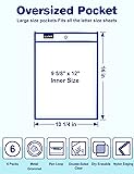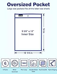 Oversized for Easy Inserting Paper: Our oversized write and wipe pockets make kids can easily change the letter size (8.5x11) or 9x12 worksheets by themselves Durable for Long Time Use: The heavy duty cloth binding makes our reusable dry erase pocket sleeves hold up to the wear and tear of the naughty kids for full school years' use Dry Erasable for Paper Reuse: It is still easy to clean the writing on the clear waterproof surface of our dry erase sleeves days later. Helpful for saving ink, paper copies, and print time Smart Design: At the top of our dry erase pocket, the black tag is a pen loop, and the middle hole allows you to hang it vertically on the wall for displaying artworks, worksheets, small samples What's in Unit Package: Each package includes 6 packs 10x14 dry erase pockets (6 assorted colors) and 1 binder rings