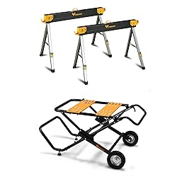 【THE BEST AT LOAD-BEARING】Heavy duty saw horses are 100% made of reinforced steel and are virtually indestructible, with reinforced design support legs that allow the table to withstand weights up to 2600 Lbs (single one can withstand 1300 Lbs). 【ADJUSTABLE CAST STEEL HOOKS】WORKESS metal saw horses come with a total of 4 height-adjustable cast steel hooks on the left and right side for 2 x 4 wood or to easily create custom, sturdy workbenches. 【WORK ANYWHERE, ANYTIME】This is an essential feature for a professional craftsman that you may need to carry the table saw to the work site at anytime. We designed the non-slip 8 inch rubber wheels to make it as easy and relaxing as traveling when carrying the table saw. 【THE BEST CHOICE FOR MINI WORKSHOP】WORKESS foldable table saw has a compact structure. We also designed a convenient full folding system. lmagine how pleasant it is to put a professional table saw stand into a small space. In fact, you can do it by just pulling the release pin lever. 【FITS MOST TABLE SAWS】Each base plate has 14 mounting holes (two plates in total), providing the flexibility to adjust between a maximum of 20-5/8" x 18-1/2" to a minimum of 6-29/64" x 18-1/2" mounting space to flexibly match the table saw you are using.