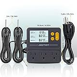 - This timer thermostat is a multi-function temperature controller and timer hybrid. Three outlets that can work individually separately. lighted LCD screen display is easy to read. The case is designed with fireproof ABS material for human engineering. The temperature sensor is waterproof with high quality, high-accuracy. Features: Large LCD screenPower-off memory function, the setting will be saved. Display the sensed temperature, setting temperature, and custom icons on the display to indicate working mode, glare-free and eye protected. Support reading with Centigrade or Fahrenheit unitEasy to use, plug and play design. With a temperature correction functionAllow users to adjust measuring accuracy based on different probes, etc. Delay starting protectionProtect refrigerating compressor lifetime, avoid compressor to start frequently. High and low-temperature alarms are availableSpecifications: Power Supply: 100-240VAC 50/60HZMax current: 10A per outletTemperature Control Range: -10~120℃, 14~248℉Temperature Control Mode: Heating or CoolingTemperature Accuracy: ±1℃, 1℉Buzzer Alarm: High and Low-Temperature AlarmSensor Type: Waterproof NTC SensorSensor length: 2m(6.56ft) Power Cable Length:1.4m (4.6ft) Please note: The controller will save all settings when power failure. The DIGITEN products are guaranteed to the original owner for one year against defects in workmanship and materials. If there are any questions, please contact us, we will help you. Packaging includes: 1 x TTC1003 Temperature Controller2 x Temperature sensor1 x Manual