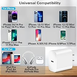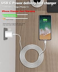 - iPhone Fast Charger Product Key Features of High Quality 3X Faster Charging Compared with 5W original Charger,this PD fast wall Charger for iPhone could save more than 1 hour for you.Lightning Charger charges for iPhone 14 13 12 up to 50% in just 30 minutes. Apple M-F-i Certified 10FT Data Sync Fast Charging USB C to Lightning Cable: 10Ft USB-C to Lightning cable let you can work and charge your iPhone/iPad anywhere, support 480Mbps data syncing and easy for charging on different occasion, for travel, home, car, office, etc. Made with original Apple Chip, the USB C to Lightning cord full support with iOS versions. Superior Safety Fast Charging: Match UL safety standard to avoid over-load, short current and overheat.Continuous high-power output will have a temperature rise, but they are all within the safety limits of standard certification. Compact Design Ultra compact and lightweight designe ensure maximum portability wherever you want to go.Just slip into your bag or pocket and enjoy your trip.It's an ideal choice for office,game,daily life,outdoor,travel and business trip.What's more you can get two fast charging chargers and two lightning cables and it can be used in any places. iPhone Fast USB C Charger Compatible with PD Fast Charging Devices : Compatible for iPhone 14/14 Plus/14 Pro/14 Pro Max Compatible for iPhone 13/13 Pro/13 Pro Max/13 MiNi Compatible for iPhone 12/12 Pro/12 Pro Max/12 MiNi Compatible for iPhone SE 2020/iPhone 11/11 Pro/11 Pro Max Compatible for iPhone XS Max/XS/XR/X/8 Plus/8/7 Plus/7 Compatible for iPad Pro 10.5"",iPad Air 3 10.5"",iPad MiNi 5 7.9 Compatible for iPhone 6 6 Plus,6S 6S Plus,5c,5s,5,iPad air,iPad MiNi,iPad Pro and more Apple devices in a original Charging speed Package includes: 2 x USB-C Fast Wall Charger,2 x 10FT USB C to Lightning Cable