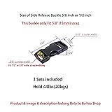 【Dual-side Adjustable And NO Sewing】The regular 1/2 inch side release buckles require you to stitch one of them in place, No sewing is needed with Our 1/2 inch plastic buckles, you can adjust the strap on both sides of these plastic buckles because of two slots on both sides of these 1/2 inch plastic buckles. 【Easy replacement】Easy to replace the regular 1/2 inch side release buckles or broken buckle on the hiking backpack, Belt, fanny Pack, Bayby carrier,waist pack,dog collars,harnesses, cat collars, boat covers etc. Only insert the straps throungh two slots on both sides of 1/2in plastic buckles without sewing. 【Strong】The plastic buckles are made of good flexible POM . These 1/2 plastic buckle clips passed 3000 tensile tests,the plastic buckle clips can withstand a pulling force of 44LBS(20kgs),hold tension well. 【1/2 inch strap buckle】The plastic buckle clips 1/2 inch are used on 0.5"/0.625"(15mm) wide straps,also called 5/8" strap buckles. The 1/2 inch Plastic buckle clip itself’s Size: 49x21x7mm(LxWxT). 3 Sets included. 【Great plastic buckles replacement】Great as webbing buckle and Strap buckle,easy one-handed release and no accidental release. These plastic buckle clip 1/2 inch are quite easy to clip and un-clip.Quick and safe fastening.Great as 1/2inch replacement buckles. 【1/2 inch buckle】Please measure the width of strap or belt on your hand. if their width is 1/2 inch or 5/8 inch(15mm),So please buy this 1/2 inch plastic buckles.it is also called 5/8" buckle.
