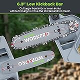 - WORKPRO Mini Chainsaw, 6.3“ Brushless Cordless Power Compact Chain Saw with 4.0Ah Battery, One-Hand Operated Portable Wood Saw with Replacement Chain for Garden Tree Branch Pruning, Wood Cutting