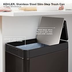 - Crafted with thoughtful details and smart functionality, the Kohler step trash can collection will simplify your daily home routine and meet the style demands of its surroundings. This 13-gallon slim step trash can has been designed to fit and any brand of 13-gallon trash bags. Its bifold lid slides open with a sturdy foot pedal, allowing for hygienic, hands- use. The trash can has an efficient footprint with clean lines and flush features, so it can be placed in compact locations—right against the wall or cabinets—with a unique lid design that stays clear of its surroundings during operation and bag changes.