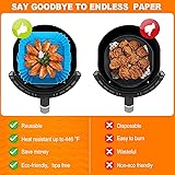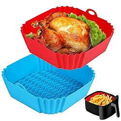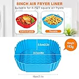 [2-PCS Air Fryer Silicone Liners] Our square silicone air fryer liners is thicker, It's about 67mil thick, it's not fragile. 8 inches/ 20.5 cm in side length, 2.2 inches/ 5.5 cm in height, Fits 4 to 7 QT Air Fryer. [Food Grade Silicone Material] Air fryer reusable liners are made from safe, eco-friendly and tasteless highest quality food grade silicone, It's non-toxic, BPA free, Withstands temperatures up to 464 ℉ (240℃), Products have passed FDA testing. [Non-Stick & Easy to Clean] Keeps your air fryer free from food residue, grease, Completely dishwasher safe, Allowing you to avoid the trouble of hand washing. Say goodbye to sticky and burned residue. [Unique Design] The air fryer inserts has many raised lines on the bottom to improve air circulation and heat distribution, Helping to heat food fully and evenly. It also allows excess grease to leave the food, So you can enjoy better tasting, healthier food. [Wide Applicaton] The air fryer liners silicone is a great additional kitchen accessories, Kitchen gadgets for home must haves. Suitable for toaster, steamer, oven, instant pot and microwave, etc. You can also use it for baking, roasting, frying or holding food.
