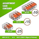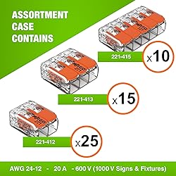 [Save Your Wrists & Re-Usable!] WAGO Lever Nuts Are Lever-Actuated for a Twist-Free, Tape-Free Connection, Simplifying Your Wiring Tasks Without Sacrificing Security. Thanks to Their Innovative Design, These Connectors, Including WAGO 221 and WAGO Lever Wire Connectors, Can Be Opened and Closed Repeatedly, Enhancing Their Usability. Ideal for All Applications, WAGO Lever Nuts, WAGO Terminals, and Other WAGO Electrical Connectors Offer a Dependable and Flexible Solution for Your Electrical Needs [Wide Application] Experience the Versatility and Reliability of Genuine WAGO Lever Nuts, Designed to Connect Any Combination of Solid, Stranded, and Flexible Copper Wires Quickly and Securely. These WAGO Connectors, Part of the WAGO 221 Series, Can Terminate Wires Ranging from 24-12 AWG. Rated for 600V and Up to 1000V in Signs and Fixtures, with a Current Rating of 20 Amps, WAGO Lever Wire Connectors and WAGO Terminals Offer Superior Performance for a Broad Spectrum of Electrical Applications [Global Approvals] WAGO Wire Connectors, including WAGO 221 and WAGO Lever Nuts, meet Industry Certifications such as UL, cUL, RoHS, REACH, and CE. Manufactured in an ISO-Rated Facility, these Connectors ensure Compliance and Safety across Various Applications. Perfect for Secure and Reliable Connections, WAGO Connectors and Terminals are Versatile enough for Worldwide Use, adhering to Global Standards for Quality and Safety. Their Extensive Certification makes them Ideal for all Applications [WAGO Assortment Case] Keep Your WAGO Wire Connectors Organized and Readily Accessible with Our Heavy-Duty, Convenient Wire Connector Kit, Designed for Optimal Organization and Easy Access. This Kit Features a Selection of WAGO Connectors, Including 25 PCS WAGO 221-412, 15 PCS WAGO 221-413, and 10 PCS WAGO 221-415. Tailored to Connect and Protect Wiring Efficiently, it also Includes WAGO Lever Wire Connectors, Offering a Versatile Solution for All WAGO Terminal Electrical Applications [12-Months Money Back Guarantee] Ensure Reliable Installations with WAGO Lever Nuts, utilizing Top-Notch WAGO 221 Technology for Quick, Tool-Free Connections. These WAGO Connectors and WAGO Terminals simplify Electrical Work, enhancing Productivity. As the Pioneer of Spring Pressure Technology since 1951, WAGO remains the Market Leader, with Billions of Connections in Service Worldwide. This legacy is supported by a 12-Months Money-Back Guarantee, ensuring Trust in WAGO's Dependable Solutions