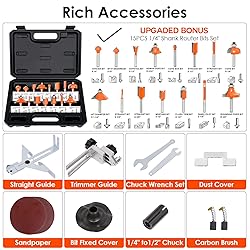 Powerful Motor & 6 Variable Speeds: The 6.5 amp motor with the max horsepower of 1.25 provides plenty of power and durability required to cut in various materials. The variable speed control dial (10000-30000 RPM) enables the user to match the speed to the application for greater versatility. Easy to Operate: Clear plastic fixed base provides a better line of sight while trimming. Smooth rack-and-pinion depth adjustment for easy and precise operation. Ergonomic Design: Rubber-covered handle and small body for increased comfort and control. Efficient cooling system for improved durability. Wide Application: Widely used in wood trimming, wood grooving, wood drilling, handicraft production, wood processing, cabinet processing, surface finishing, chamfering, curve cutting, pattern processing, and DIY. What You Will Get: 15 pieces 1/4" shank router bits set(Bonus Gift!), 1x 110V compact router, 10 x sandpapers, 1 x 1/4" to 1/2 " router collet, 1 x straight guide, 1 x guide plate, 1 x trimming guide, 1 x Bit Fixed Cover, 1 x Storage Bag, 2 x wrenches, 2 x carbon brush, 1 x bolt, 1x screw, 1 x manual, and our easy-reach customer service.