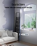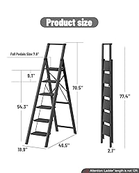 Solid Construct Holds 300 lbs: The step stool is made of strong aluminium alloy and the side cross brace structure strengthens the basic support. The top handle provides extra stability when you going up and down the ladder. With the non-slip feet, the ladder is not slide on tile or wood floors. So you will feel safe even on the top step 7.9 " Deep Steps Ensure Safety: The steps of the ladder are wide to give more space to move, perfect for people who need a flat wide step. This stool allows you at 5'2" to reach the top shelf of your cabinets or high ceilings Lifts With One Hand: Our aluminum ladder weighs 17 pounds net, which is lighter than the iron ladder. It is pretty easy to carry around which does make it great for transporting anywhere you need to bring in your home without hitting furniture and walls Folds Slim to 2.1'' Like A Wallet: Unfolded:70.5"H X46.5"L X 19"W,Folded: 77.4''H X 19"L X 2.1"W.It's very simple to open and close. The step ladder has a very slim profile when folded, so you can tuck it away in a small space and can be easily hidden away from view As A Decorative Stool: Our kitchen ladder with a stylish design, can be well blended into home decor. It can be used like a piece of furniture. Such as a ladder shelf, a flower pot holder, a night stand, a plant shelf, etc Tall enough: The top of 6 step ladder is 4.525 feet from the ground. If you're 5.5 feet tall with a 12 foot ceiling, this ladder is enough to change your ceiling light bulb and air filter