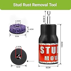Clean Thoroughly: Simultaneous cleaning of the hub and studs using an internal stainless steel stud cleaning system designed to thoroughly remove debris from the felly, tread, studs and brake drums that could affect the overall tire Quick Scale Remover: Wheel Stud Rust Removal Tool is easy to removes rust, and other debris build up on tire rim, wheel studs and brake drums. wheel stud thread cleaner,Metal remover tool for cleaning metal surfaces and bolts or screws, and internal stainless steel bolt Work With Impact Gun: Stud cleaner for drill, wheel hub cleaner rust removal tool can work with 1/2in drive impact gun, support air or electric mode for quick cleaning Good Composition: Wheel stud cleaner removal tool with 2 grinding wheels, when using with a 1/2in impact wrench or electric drill for fast and efficient use With Wire Brush And Grinding Wheel: Wheel stud cleaner with light weight design has an internal wire brush and a removable grinding wheel on the lower end for effective removal of rust from metal surfaces and screws and bolts, additional grinding wheel attachments can be install