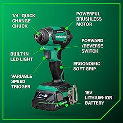 HIGH PERFORMANCE POWER TOOLS: This combo kit includes the 18V Brushless Driver Drill (DS18DEX) and 18V Power Impact Driver (WH18DEX), delivering up to 620 in-lbs and 1,549 in-lbs of turning torque respectively. Ideal for contractors, homeowners, and DIY. BRUSHLESS MOTOR TECHNOLOGY: Ensures more run time, increased power, and extended durability. Each tool features a LED light to illuminate dark workspaces, and the Cordless Driver Drill features Reactive Force Control (RFC) for added safety. LIGHTWEIGHT AND COMPACT: Both the Driver Drill and Impact Driver tools are under 3 lbs (without battery) and compact (Driver Drill is 6.1" in length and Impact Driver is 4.72" in length), reducing user fatigue and allowing access to tight spaces. LONGER RUNTIME WITH METABO HPT BATTERY: The kit includes 2x 2.0Ah 18V Metabo battery with charge indicators for extended run time. The batteries are compatible with 18V and 18V/36V MultiVolt tools, doubling your runtime for up to 8.0Ah per charge. CHOOSE METABO HPT FOR QUALITY AND RELIABILITY: This Driver Drill & Impact Driver Combo Kit is backed by Metabo HPT's Lifetime Tool Body, 2-Year Battery, and 1-Year Charger Warranty. Get more durable power tools at the Metabo HPT store.