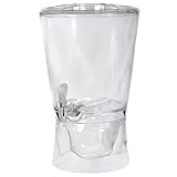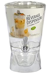 - Serve your guests in style with the 3.5 gallon beverage dispenser It is practical for serving at gatherings because of its sturdy base, which makes the container easy to fill This clear beverage dispenser also has a dripless spigot which allows carefree pouring without the threat of spillage or leaks This beverage dispenser is asthically pleasing as it is functional as a large clear container for colorful tea, fruit flavored water, your favorite adult beverage or any cold beverage This is BPA free and made of durable acrylic that safe to use You can also fill the base with ice for additional cooling Lid has cut out to store your garnishes.