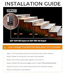 3 Color Temperature:Cloudy Bay designed the step light with 2700K/4000K/6000K selectable LED to give off the right amount of light in the dark. Waterproof and Anti- Corrosion: Die-casting of aluminum housing, anti-corrosion and waterproof, ideal for outdoor use, concise and elegant. Come with waterproof wire connectors included in the package also provide a better performance in wet location Energy Saving: Powered by 12-24V AC/DC, our low voltage deck lights are able to provide 90 lumens output with 2.5 watts of energy, equivalent to the output of 15W halogen light, saving energy and electric bill Easy Installation: No need for gang box. Comes with all mounting hardware accessories for quick installation. 3 Year Warranty: Based on 3-5 hours’ everyday use,Cloudy Bay Lighting offers a 3 year warranty.If for any reason you are not satisfied with your purchase, please contact us for an easy and fast replacement