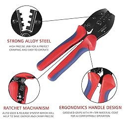 【Package Contents】Comes with 10 pairs solar panel connectors Male & Female + 12 pairs solar connector pins (male & female) + 2pcs spanners + 1pcs wire crimping tool. 【Compatible Cable】Compatible with PV cables with different insulation diameters (AWG13-10). 【Product Features】Operating temperature: -40℉ to 257℉; Rated voltage: 1000V DC; Rated Current: 30A. 【Waterproof & Dustproof】Design with sealing ring for dust resistance and waterproof, degree of waterproof is IP67; Flamebility rating is UL94-V0. 【Premium Material】This type fof solar kits made of PPO insulation material, contact material is tin-plated copper. PPO material with excellent aging resistance and UV endurance, can resist severe weather such as heavy rain, snowstorm or heat for a long time. 【Accurate Design】High carbon steel wire crimping tool produce by accurate molds, complete locking and ratcheting mechanism design to ensure high of crimping quality when crimping repeatedly (2.5/4/6 mm²). 【Humanization Handle】Crimping tool assembly with comfortable & non-slip PP+TPR handle that using easily and energy saving.