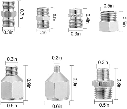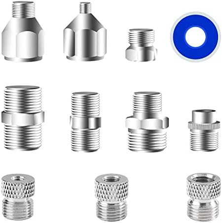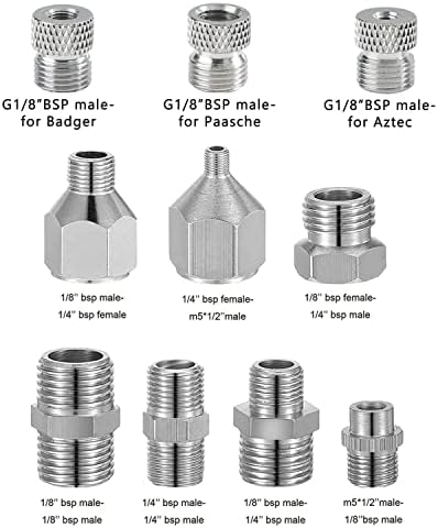 - ALL-IN-ONE 11 PCS ADAPTER KIT: A comprehensive solution for airbrush connectivity. This professional set includes 10 different metal adapters and 1 roll of Teflon thread seal tape. It solves the mismatch problem between your airbrush, compressor, and hoses, ensuring a seamless workflow for modelers and artists.