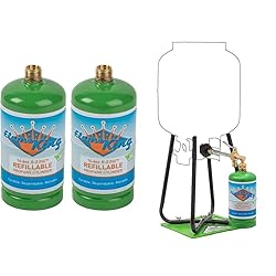 Reduce waste and save money by using refillable propane cylinders instead of disposable tanks (Flame King). Refillable cylinders are DOT compliant, legally and safely refillable and transportable (Flame King). Refill kit includes commercial adapter, refill stand, and instructions for easy backyard refilling in 4 steps (Flame King). Cylinders compatible with Mr Heater, Weber, Coleman and other appliances using 1 lb tanks. Powder coated steel construction for durability; 12 year DOT certification (10 years in Canada).