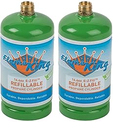 - Flame King Refillable 1 lb Empty Propane Cylinder Tank - Reusable - Safe and Legal Refill Option - DOT Compliant-16.4 oz (2-Pack), green (YSN164-2)The Flame King 1 lb (16.4oz) - (2-pack)-refillable propane cylinders fit all appliances that today's non-refillable tanks work with. This propane bottle is legally & lawfully refillable & transportable - just like your BBQ tank is. Our unique & patented valve design is not available from any other manufacturer. These refillable propane cylinders are perfect for practically every Mr. Heater, Weber, coleman & similar outdoor type applications that would fit a disposable tank. Spend your money wisely & buy the last 1 lb propane cylinder you will ever need! Tossing a single-use disposable tank is just a silly waste of resources & can be a potential huge problem in the waste stream! Join the eco-revolution! Please note: This refillable cylinder is designed to be refilled directly from your standard BBQ cylinder, not at a propane refill station. In order to refill it from your BBQ cylinder you will need to use a refill adapter, not included but available with the Flame King refill kit. High grade steel construction - x-ray & Hydrostatic tested - powder coating for long lasting exterior protection - dot & TC certified for 12 years (10 years in Canada) - UL1769 listed.Flame King Refillable 1 lb Empty Propane Cylinder Tank - with Refill Kit and CGA600 Connection - Reusable - Safe and Legal Refill Option - DOT Compliant - 16.4 oz, GreenThe Flame King 1 LB (16.4oz) refillable propane cylinder and refill kit with its CGA600 connection, fits all appliances that today's non-refillable tanks work with. This propane bottle is the only legally & lawfully refillable & transportable option, as well as DOT compliant. Our unique & patented valve design is not available from any other manufacturer. These refillable propane cylinders are perfect for practically every Mr. Heater, Weber, Coleman & similar outdoor type applications that would fit a disposable tank. Our commercial refill adapter fits on any standard 20 LB propane tank. Spend your money wisely and buy the last 1 LB propane cylinder you will ever need! Tossing a single-use disposable tank is just a silly waste of resources & can be a potential huge problem in the waste stream! Join the eco-revolution! Please note: these cylinders fill fastest & safest with our commercial Flame King refill adapter - included with this kit! High grade steel construction - x-ray & Hydrostatic tested - powder coating for long lasting exterior protection - DOT & TC certified for 12 years (10 years in Canada) - UL1769 listed. 20 lb propane tank is NOT included.