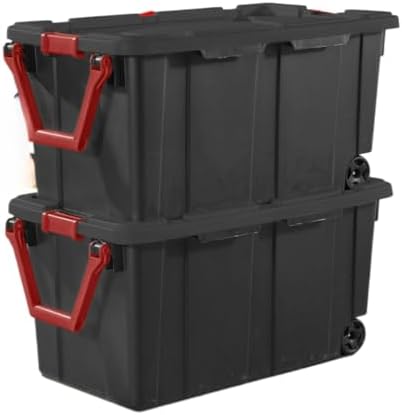 Emny Modern Plastic & Metal 40 Gallon Lidded Home Storage Bins, Stackable Industrial Storage Containers Tote, Organizing Tote Tub Box with Wheeled, Moving Boxes, Set of 2, Black