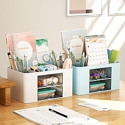 【Enough Capacity】Set of 3 compartments pen holder, 1 top tray, 1 notebook holder, and 2 drawers which have enough storage to allow for office supplies organization. Large capacity, multifunction help you arrange the desk accessories and stationaries clean and tidy.The best and safest storage option for you. Perfect Size:7.6*5.5* 3.9inch 【Practical Desk Caddy】This Ideal desktop storage box is practical for organizing and categorizing small office essentials like iPads, pencils, markers, scissors, sticky notes, notebooks, paper clips, and more, enabling you to maximize your workspace and achieve a more tidy and orderly desk appearance 【Convenient And Multifuction】This Desk Caddy is no installation required not only perfect for storing your desktop stationery and many other desk widgets but also great for storing your makeup brushes, nail polishes, lipsticks, and other small personal items sorted by type. The transparent drawer makes it way easier to find what you need! and You can put any other daily necessities on the organizer, It helps you keep your stuff organized 【Premium Material】This storage drawer organizer is crafted from durable ABS plastic, ensuring its strength and solidity for long-term use. The smooth operation of its drawers allows for easy opening and closing. Additionally, its waterproof design makes it effortless to clean, maintaining its pristine appearance over time 【Best Choice】The all-in-one desk pen organizer be certain to bring our customers more convenience in the office and be popular in our daily life. If you have any questions, please feel free to contact us and we'll help to solve it in 24 hours. You take NO RISK by ordering today