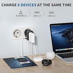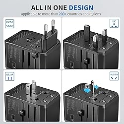 WORLDWIDE ADAPTER - Our all-in-one adapter is equipped with 4 different plug types that could plug into the sockets of 200+ countries and regions: Type C (most popular type) for use in most of Europe, including France, Germany, Italy, Spain, Iceland, Greece, and many other countries; Type G for UK, Ireland, HK, Malaysia, Singapore; Type I for China, Australia, New Zealand, Argentina; Type A for USA, Mexico, Canada, and Japan. It does NOT work in India and South Africa. 3 USB-C AND 2 USB-A PORTS - Charge multiple USB devices simultaneously at high speed through 3 USB-C port (3A) and 2 USB-A ports (2.4A). Ideal for charging smartphones, smart watch and fitness tracker, tablet, power bank, camera, handheld game console, headsets, and everything else that is charged through a USB port. VERSATILE AC OUTLET - Accept not only US plugs, but also various plugs from EU countries, UK, AU and China. Note: Our adapter does NOT convert voltage (US/Canada: 110-120V, most other countries: 220-230V), ensure the AC-powered device intended to use abroad supports dual voltage (the input spec reads “100-240V, 50/60Hz” on it). For electric toothbrush, shaver/trimmer, water flosser, garment steamer, hair straightener, CPAP machine, it is critical to check the specs before your trip. ABOUT HIGH-POWER APPLIANCES OVER 2000W - Many hair dryers, irons and electric kettles fall into this category. Even if they support dual voltage, it is still NOT recommended to use them in a country with different voltage due to potential hazards (the built-in 10A fuse might pop to prevent further damage). Many manufacturers do NOT make dual voltage high-power devices (for a reason), and NO portable voltage converters can handle such high-power safely over an extended time. PORTABLE AND SAFE - This compact and lightweight travel essentials is ideal for travelers, overseas business, work, and students. It does not have surge protection and can be conveniently used on a cruise ship as well. Built-in 10A fuse, safety shutters, separate plug lock system, RoHS, CE, and FCC certifications provide extra peace of mind. TIPS: If you need more fuses, you can search for "TA-105C replacement fuse" on Amazon for purchasing. Please ensure that you're selecting Epicka 10A fuses.