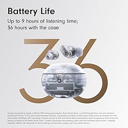 - Powerful Sound. Perfect Fit. Beats Studio Buds + feature powerful, balanced sound, Active Noise Cancelling (ANC), Transparency mode, high-quality calls, enhanced Apple & Android compatibility, up to 36 hours of battery life1 and 4 ear tip options to ensure a comfortable all-day fit. Powerful, Balanced Sound Beats’ custom acoustic platform delivers rich, immersive sound whether you’re listening to music or taking calls. Each bud is equipped with a custom two-layer transducer that flexes to deliver cleaner bass and ultra-low distortion. Three acoustic vents improve audio precision and gently relieve pressure for a more comfortable all-day fit. Active Noise Cancelling At the touch of a button, two dynamic listening modes let you choose whether to keep the world out or let it in. Active Noise Cancelling adapts to your personal fit, neutralizing unwanted external noise. With 3x larger microphones, new venting, and a powerful processor, Beats Studio Buds + has up to 1.6x more active noise cancelling power and up to 2x improved Transparency.2 Transparency Mode Transparency mode blends your listening experience with the world around you. External-facing microphones capture ambient sound to mix in with your music when you need to be aware of your surroundings. Surrounds You in SoundBeats Studio Buds + support spatial audio for immersive music — delivering a surround sound experience — that you can take anywhere.3 It’s like being surrounded by 64 speakers at once. All-Day Comfort With four ear tip options (XS, S, M & L) to fit a wider range of ears, Beats Studio Buds + create a comfortable acoustic seal for the best listening experience, securing your earbuds in place. More Music, Less Charging With up to 36 hours of total battery life4 from the sleek, pocket-sized charging case, Beats Studio Buds + are ready to go whenever you are. Crystal Clear Calls 3x larger microphones5, powerful ANC, and a voice-targeting algorithm precisely filter background noise for crisp, clear call performance. On-Device Controls Simple, customizable on-ear controls allow you to manage music, toggle listening modes, take calls and activate voice assistant using the ‘b’ button. Enhanced Apple & Android Compatibility Beats Studio Buds + offer a robust set of native Apple and Android features including: one-touch pairing, automatic switching, ‘always on’ voice assistance, and ‘Find My.’6 In the Box Beats Studio Buds + Pocketable charging case Eartips with four size options USB-C to USB-C charging cable Quick Start Guide Warranty card 1 Testing conducted by Apple in March 2023 using preproduction Beats Studio Buds + and Charging Case units and software paired with iPhone 13/iPhone 14 units and prerelease software. The playlist consisted of 358 unique audio tracks purchased from the iTunes Store (256-Kbps AAC encoding). Volume was set to 50% and Active Noise Cancellation and Transparency were turned off. Testing consisted of full Beats Studio Buds + battery discharge while playing audio until the first Beats Studio Buds + stopped playback. Testing consisted of full Beats Studio Buds + battery discharge while playing audio until the first Beats Studio Buds + stopped playback. Battery life depends on device settings, environment, usage, and many other factors. 2 As compared to Beats Studio Buds (1st generation). 3 Compatible hardware and software required. Works with compatible content in supported apps. Not all content available in Dolby Atmos. 4 Testing conducted by Apple in March 2023 using preproduction Beats Studio Buds + and Charging Case units and software paired with iPhone 13/iPhone 14 units and prerelease software. The playlist consisted of 358 unique audio tracks purchased from the iTunes Store (256-Kbps AAC encoding). Volume was set to 50% and Active Noise Cancellation and Transparency were turned off. Testing consisted of full Beats Studio Buds + battery discharge while playing audio until the first Beats Studio Buds + stopped playback. Testing consisted of full Beats Studio Buds + battery discharge while playing audio until the first Beats Studio Buds + stopped playback. Battery life depends on device settings, environment, usage, and many other factors. 5 As compared to Beats Studio Buds (1st generation). 6 Requires an iCloud account and a compatible Apple device running the latest operating system software or a compatible Android device running Android 8.0 or later, with Google Play Services enabled.