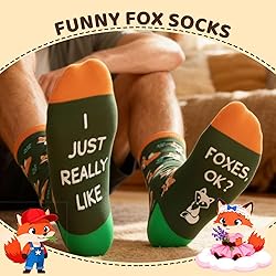 FOX SOCKS: These funny green socks feature cute foxes in various poses, from staring at you to walking briskly or stretching themselves with leaves. They also have funny sayings like "I JUST REALLY LIKE FOXES, OK?" and grippers on the soles. FOX GIFTS: Our stocking stuffers are perfect gifts for fox Lovers! They make funny gifts for moms and dads on special occasions like birthdays, Mother's Day, Father's Day, Valentine's Day and Christmas. STRETCHY UNISEX SIZE: Our unisex design fits most men's US size 6-13 feet and most women's US size 7 and up. COMFORTABLE & SOFT MATERIAL: Our socks are made of 80% Cotton, 15% Polyamide and 5% Elastane, which are soft, comfortable, stretchy and breathable.