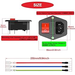 - Specifications: Voltage: 250V Current: 10A, AC Max Current Input(Module Back Current Label, Longitudinal): 10A 250V AC Max Fuse Size Install(Module Back Fuse Label, Transverse): 10A 250V AC Fit Fuse Size (L*W):5mm x 20mm Total Size: (L*W*H) 59x49x38mm/2.32x0.75x1.5inch Mounting Hole Diameter: (L*W*H) 47x27.4x22.5mm/1.85x1.08x0.89inch Screw Hole in Top Face Diameter: 3.5mm/0.14inch Screw Hole Center Distance: 40mm/1.57inch Plug Type: 3 Pin IEC320 C14 External material: Plastic,Metal Package Content: 3 x Rocker Switch Power Socket Inlet Module Plug, 9 x 18 AWG Extension Cord, 3 x 10A Fuse, 6 x Mounting Screws.