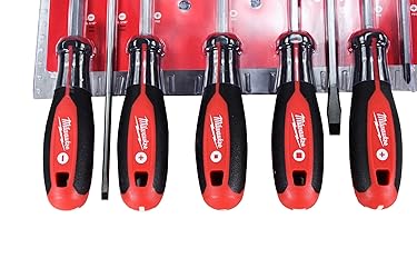 - Milwaukee 48-22-2710 10 Piece Screwdriver Set comes with Phillips #1 3", Phillips #2 1.5", Phillips #2 4", Phillips #2 6", slotted 1/4" x 1.5", slotted 1/4" x 4", slotted 3/16" x 6", slotted 5/16" x 6", square #1 and square #2. Designed with magnetic tips, tri-lobe handles, visible ID markings, wrench ready hex shanks, lanyard hole and hardened tips.