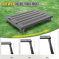 Enhanced Design with Reduced Gaps: We've made significant improvements to the design of this Lightweight Rv Step, specifically by reducing the gaps between each supporting panel on the surface. Now, your pet can enjoy a smoother and more comfortable standing experience without any concern about discomfort caused by large gaps 3-Step Height Adjustment: A convenient 3-step height adjustment feature, offering three levels at 8 inches, 9 inches, and 10 inches. Whether you need a lower or higher step, you can effortlessly adjust it to meet your specific needs, ensuring easy access in and out of your RV Wide Anti-Slip Surface: To further enhance safety, we have selected a wider anti-slip surface pattern for this stool. As the improved design provides excellent traction and stability, minimizing the risk of slipping or accidents Premium Aluminum Construction: Crafted with a sturdy all-aluminum structure and excellent welding, this rv step stool guarantees exceptional durability and long-lasting quality. Despite its robust build, it remains lightweight, making it highly portable and convenient to carry during your RV adventures Versatility and Practicality: Combining all the outstanding features of the previous model, this upgraded RV stool excels in versatility. Not only does it assist in getting on and off your RV, but it also serves as a reliable tool for various applications, such as camping, gardening, and household tasks