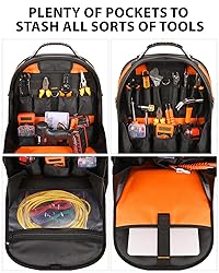 Tough Hard-Shell Design: Tool bag made of sturdy 1680D polyester with PVC hard-shell supports on each side. The internal tool pocket is reinforced with aluminum strips for stability. Enhanced joints with bone bars and handles strengthened by steel plates Rugged Molded Base: The reinforced molded bottom prevents tipping, even when the bag is filled with tools. It safeguards against punctures from sharp tools and provides protection on muddy, rugged construction sites and in adverse weather conditions Spacious Storage and Thoughtful Organization: Whether it's a long hammer and wrench, an electric drill with bits, or a large roll of wires and small batteries, you can always find a convenient storage spot in your bag Provide a Convenient Solution for Tool Mobility: Streamlining tool transportation, ensure convenience with ergonomic design and versatile storage. Fit for workshop or construction site, it simplifies access to tools, improve efficiency in various settings Removable Organizer Pocket: If you need to transport larger tools, simply remove the inner tool compartment to free up additional interior space Reinforced Laptop Compartment: Protect your electronic devices from potential damage on challenging worksites with a dedicated laptop compartment